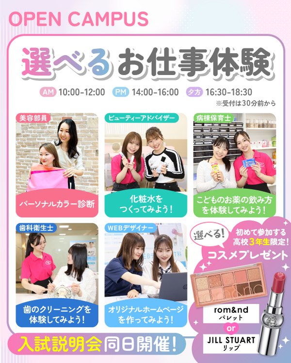 本校の一部の学科は、より自分の目指す就職先にあった学びができ、強みを持って就職できるよう、コース選択制を採用しています。例えば医療事務&くすり総合科は医療秘書・医師事務/診療情報管理士/くすりアドバイザーの3つのコースから、WEBデザイン・IT科はWEBデザイン/ITプログラミングの2つのコースから自分に合ったコースを選択できます。コースに分かれるのは、1年次後期または2年次からになりますので、入学後に自分に適したコースをじっくり選択できます。